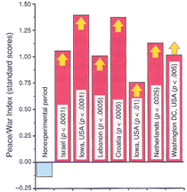A later investigation (refer to chart below) replicated this study and extended it to a longer period of time, two years and three months (1983-1985). During this period of time seven assemblies of TM-Sidhi Program Yogic Flyers were held in the Middle East, in Europe, or in North America, which were predicted to have an influence on Lebanon according to the size of the group of Yogic Flyers. A time series analysis of daily data found that during these seven assemblies there was a 71% reduction in war casualties, a 68% reduction in war injuries, a 66% mean increase in cooperation among antagonists, and a 48% reduction in level of conflict; each of these effects was statistically significant. When all four of these variables were combined into one overall index of peace, a statistically significant increase of peace was measured in Lebanon during each of the seven assemblies [41].